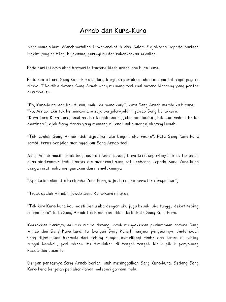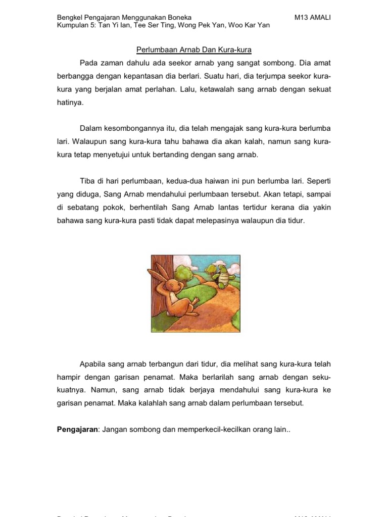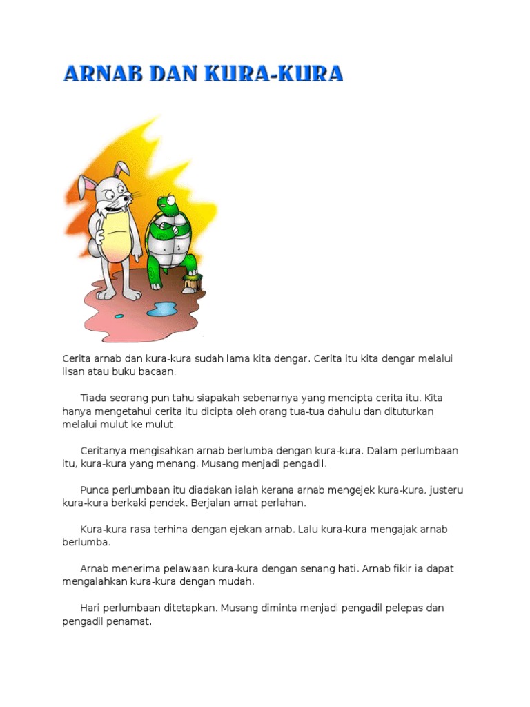 Lampiran cerita arnab n kura by Mohd Fathi Radhi 7881 views. Sedang Sang Arnab berlari-lari sambil menyanyi tiba-tiba Sang Arnab melihat Sang Kura-Kura sedang berjalan. Pengajaran cerita arnab dan kura kura by manrazi1980 6822 views.