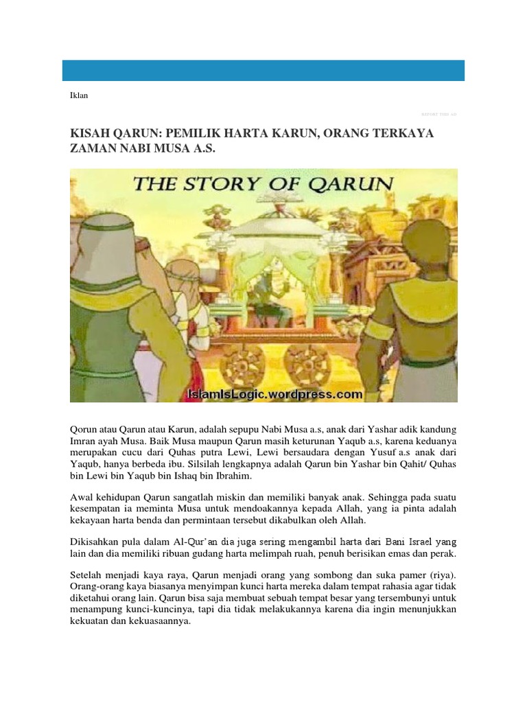 Qarun menurut Ibnu Ishak adalah pamannya Nabi Musa as. Kisah qarun merupakan salah satu isi kandungan al quran dalam lingkung akhlak dan qisah. Cerita dalam Al Quran - Kisah Tenggelamnya Harta si Qarun Kastari Animation OfficialIstilah Harta Karun berasal dari cerita Harta Qorun.